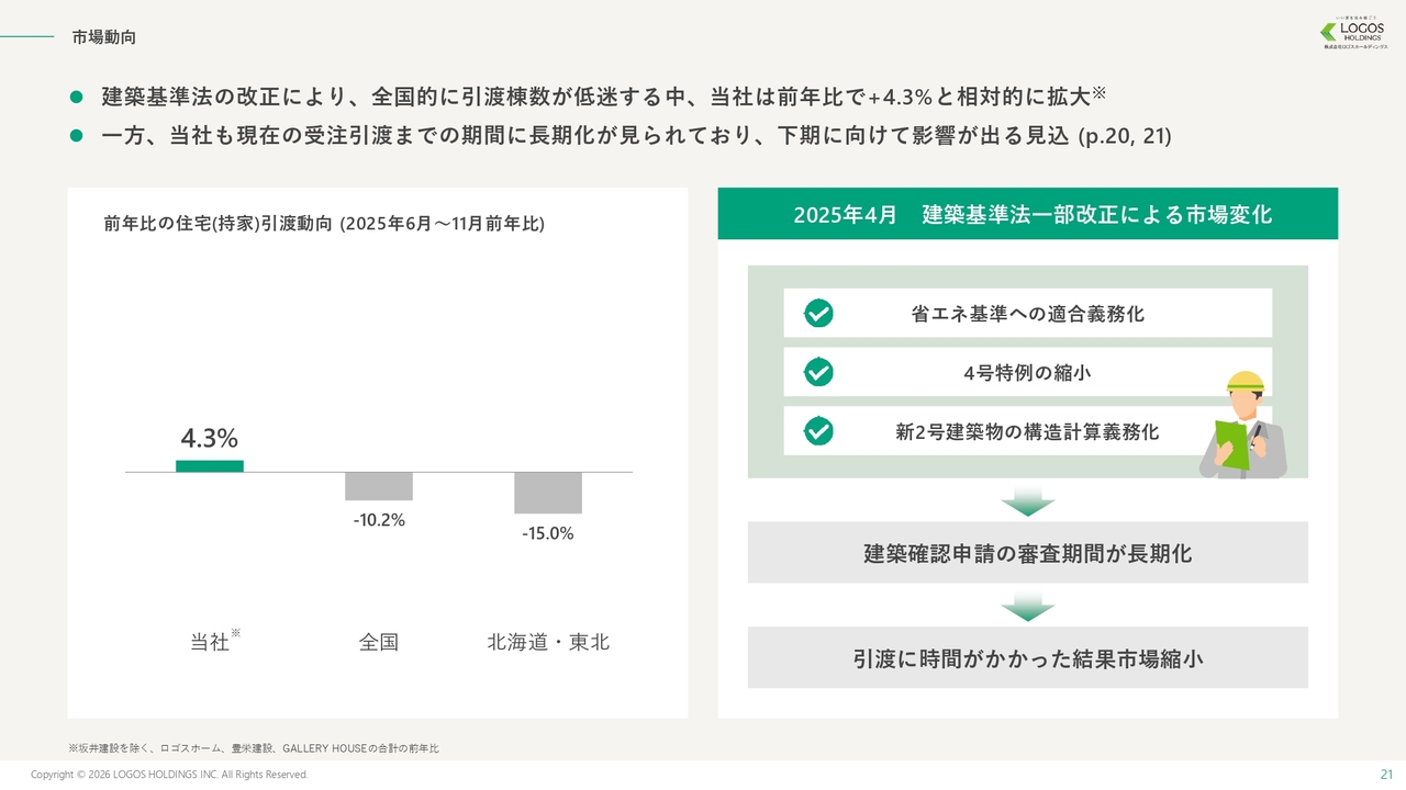 池田:市場動向についてです。今期は、昨年4月に建築基準法が改正され、建築確認申請の審査期間が非常に長期化しました。当社でもその影響が見込まれていたため、四半期ごとの売上見込みを若干修正しました。