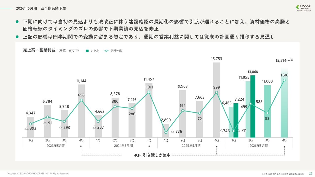 今期の営業利益は、それらの影響が解消されたうえで、坂井建設の売上の通期寄与やロゴスホームのエリア拡大および既存シェアの拡大により棟数が増加しました。これにより、人件費や広告販促費などの増加分を吸収し、利益率の改善が実現しました。