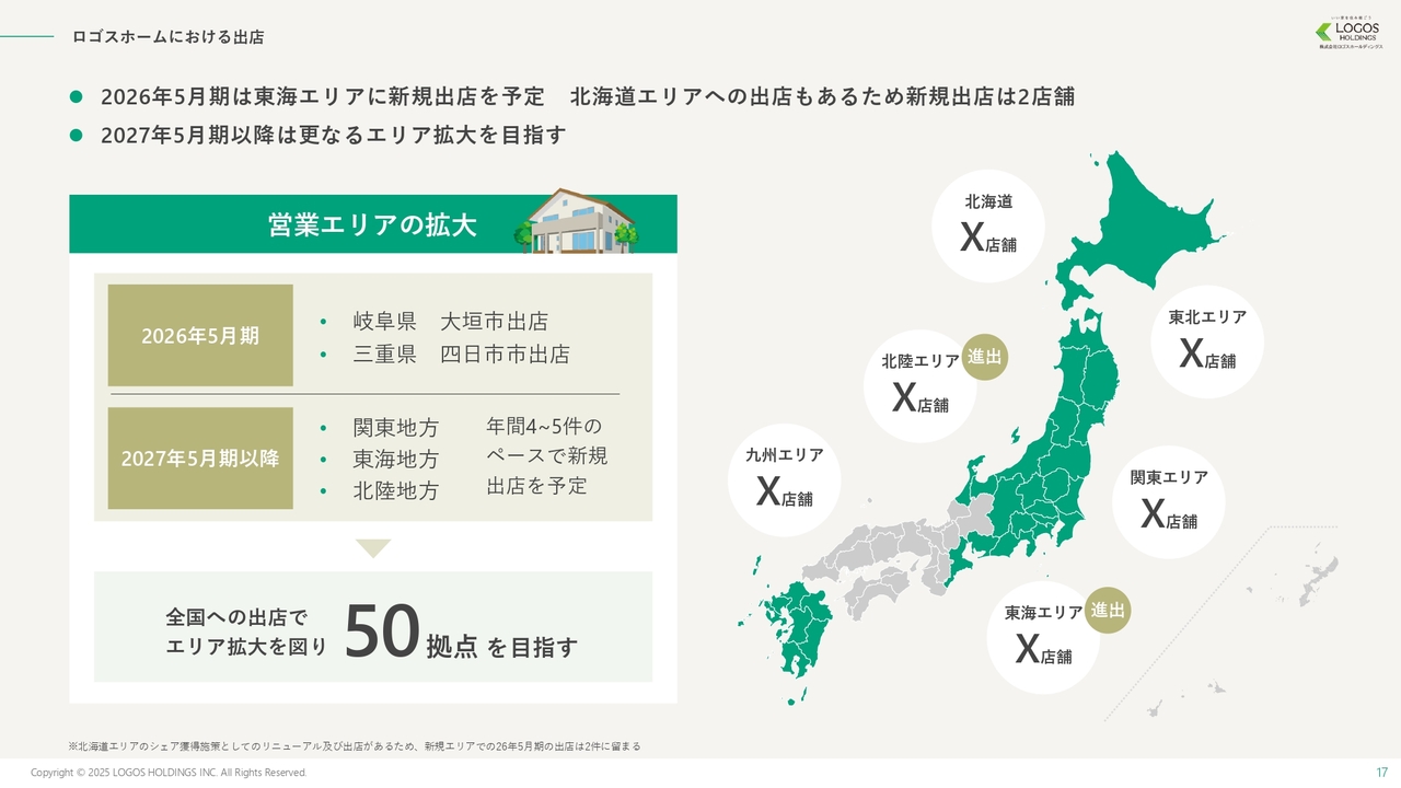 今期中には岐阜県大垣市への新規出店を予定しています。2027年5月期以降は、東海エリアを中心に関東や北陸への出店も計画しており、年間5件程度のペースで出店拡大を進めていく予定です。