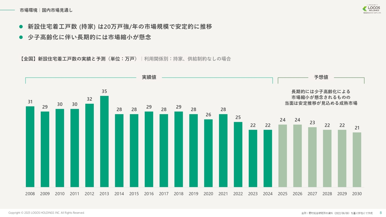 池田:住宅産業は穏やかに縮小している市場である一方、8兆6,000億円規模という非常に大きなマーケットがあります。この市場では寡占的なプレイヤーが存在せず、分散された構造となっています。