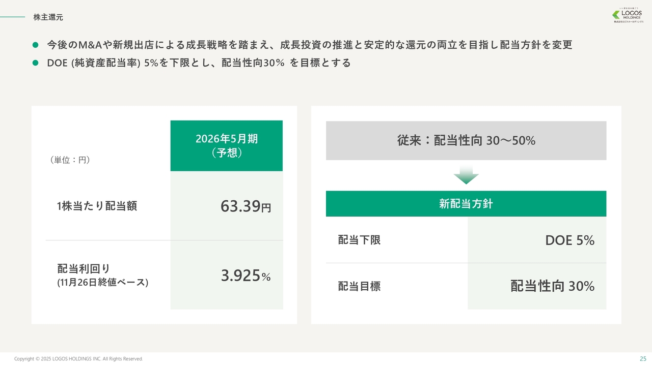池田:株主還元についてです。成長投資と安定的な株主還元の両立を目指し、DOE5パーセントを下限として、配当性向を30パーセントに変更しました。これにより、2026年5月期の予想配当は前年同期比約40パーセント増となる、1株当たり63.39円を予定しています。