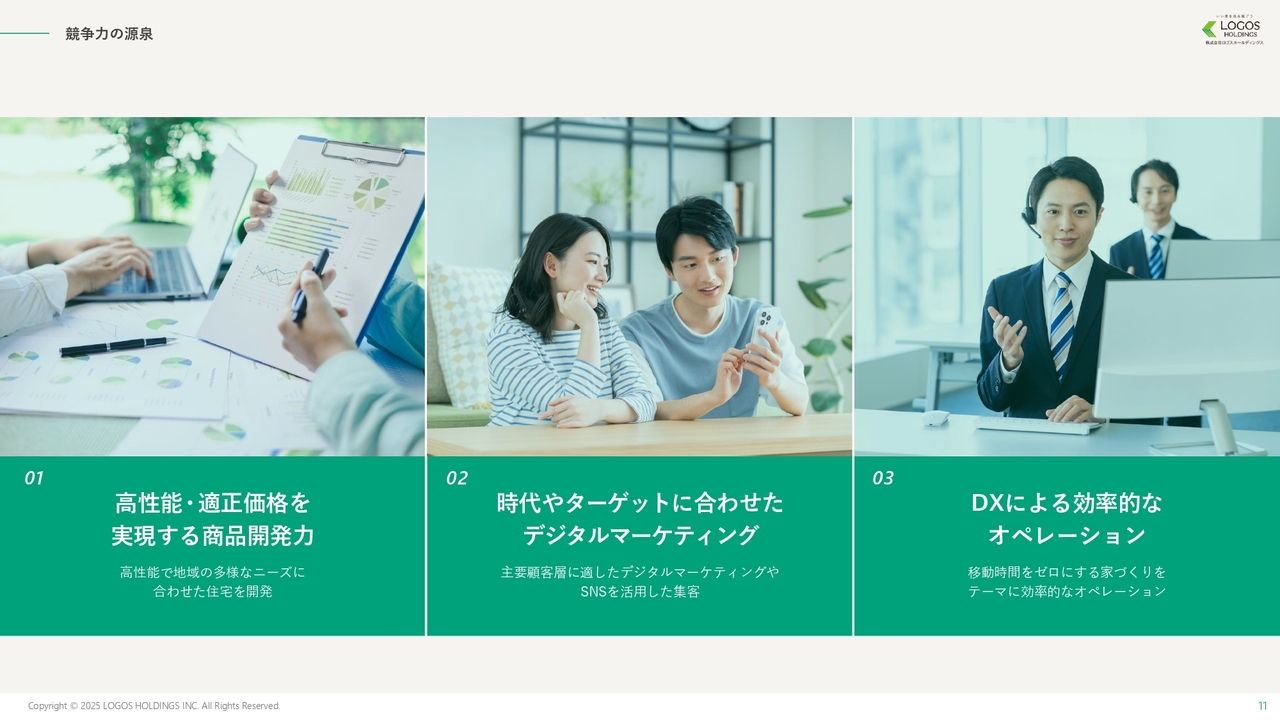 池田:当社の成長理由と強みについて3つお話しします。1つ目は商品開発力、2つ目はデジタルマーケティング、3つ目はDXによる家づくりです。これらの強みによって、他社には模倣しにくいビジネスモデルを構築していると考えています。それでは、順番にご説明します。