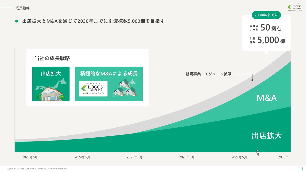 2030年までに、グループ全体での引渡棟数を5,000棟にすることを目指しています。具体的には、グループの中核である住宅会社ロゴスホームの出店拡大により2,500棟のオーガニックな成長を実現します。