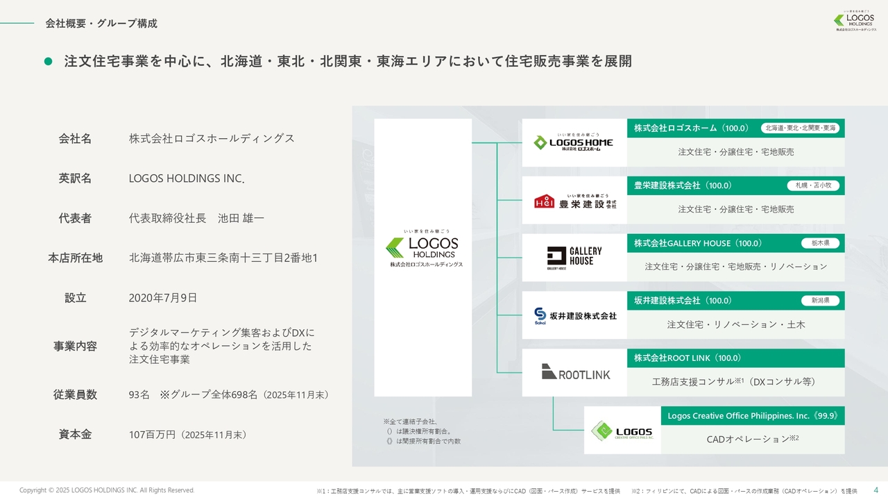 池田:まず、会社概要です。私は2003年に北海道の帯広で、スライド右側のグループの中の一番上にあるロゴスホームという会社を創業しました。現在、グループ会社は7社あり、注文住宅をメインとして、高性能・高品質な家を適正価格で提供することを使命に全国へ出店し、エリアを拡大しています。