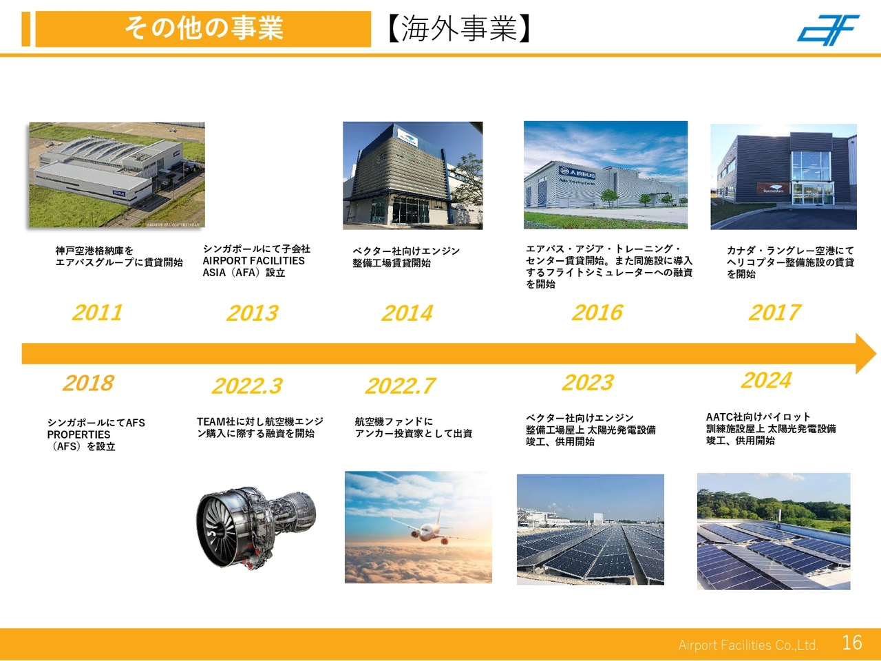 笹岡:4つ目のセグメントである「その他の事業」は、海外事業と太陽光事業の2つです。スライドは海外事業に関する資料になります。規模はまだ小さいものの、2013年以降、シンガポールやカナダの空港で不動産事業を展開しています。