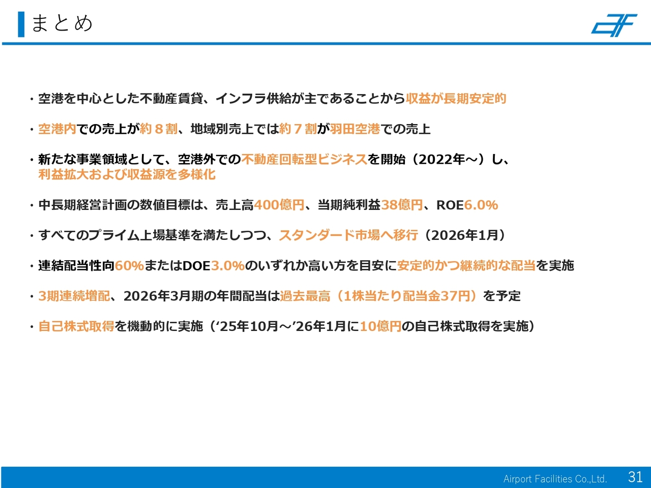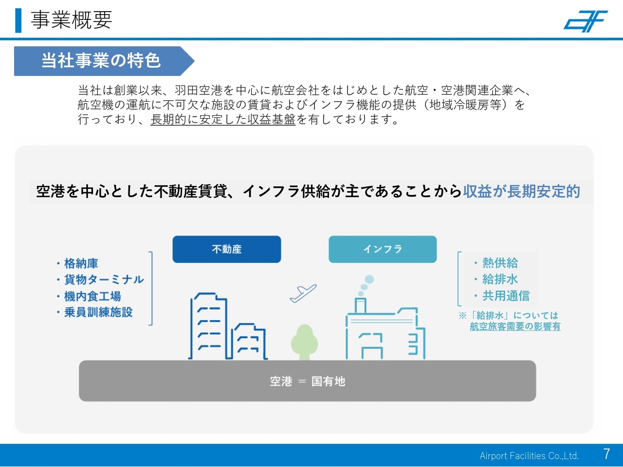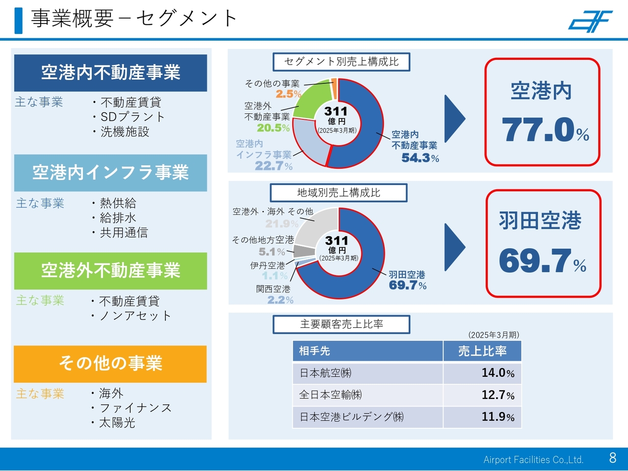 まず、当社は空港を中心とした不動産賃貸およびインフラ供給を主な事業としており、収益は安定的であること、空港内での売上が約8割、また地域別では約7割が羽田空港での売上であることが特徴です。