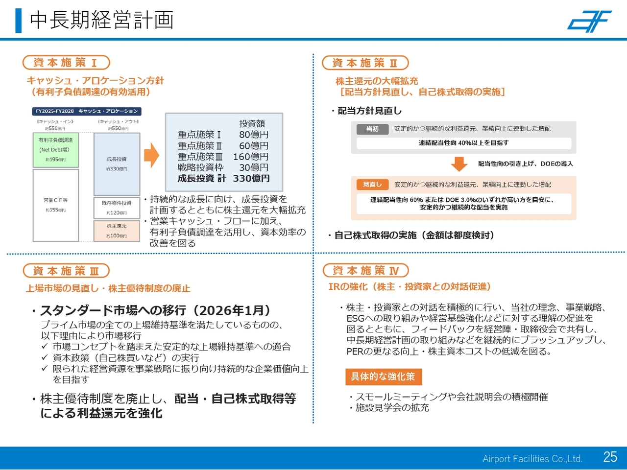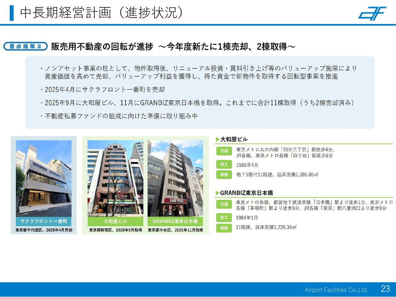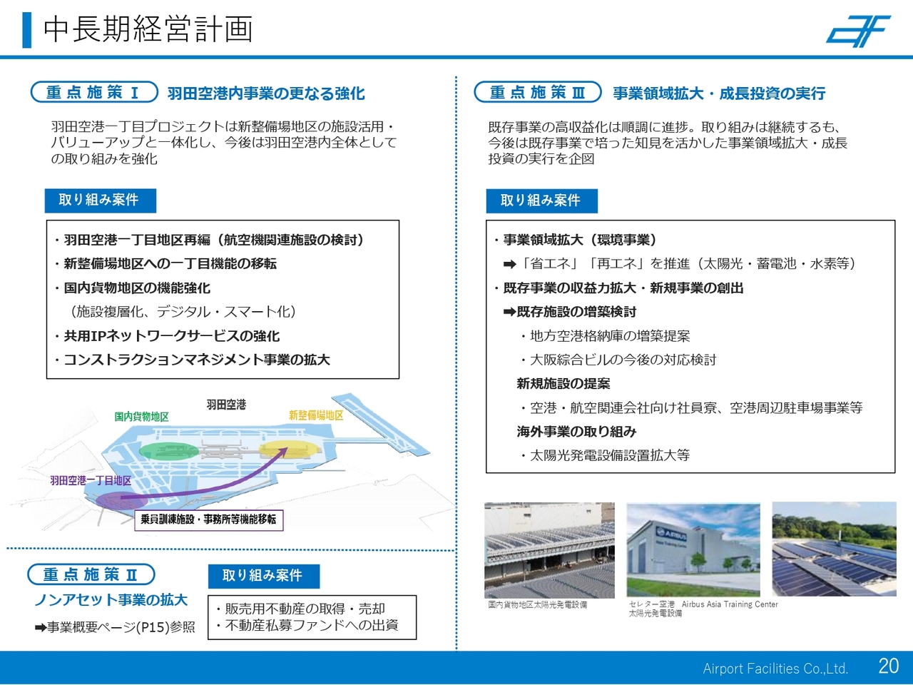 各重点施策の概要についてはご案内のとおりですが、重点施策Ⅰ・Ⅲにおいて、羽田空港一丁目プロジェクトをはじめとする、「事業基盤である空港内での投資を積極的に進め、安定的な利益を積み上げていく」とともに、重点施策Ⅱにおいて、「安定的な空港内事業をテコにしたノンアセット事業により、利益成長と資本効率の向上を図る」という考えです。なお、ノンアセット事業は2022年の中長期経営計画策定時に、当社にとって新たな事業領域として、利益の拡大、収益源の多様化の取り組みの一環としてスタートしたもので、不動産回転型ビジネスは堅調に推移しており、不動産私募ファンドの組成に向けた取り組みも行っているところです。