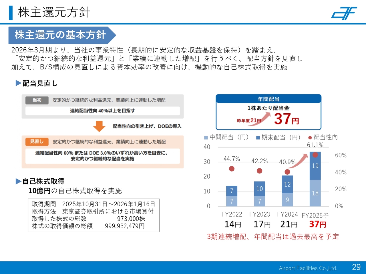 笹岡:株主還元方針についてです。当社の株主還元方針は、先ほどご説明したとおりです。スライド右側のグラフにあるように、当社は3期連続で増配を達成しており、今期は過去最高となる1株当たり年間配当金37円を予定しています。