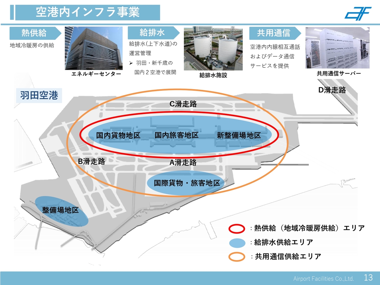 また、空港内の諸施設に対して熱供給や通信などのインフラサービスを提供しており、この2つを事業の柱としています。