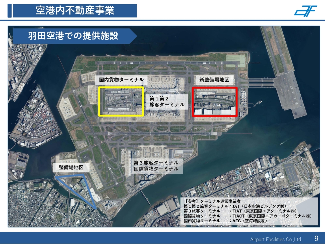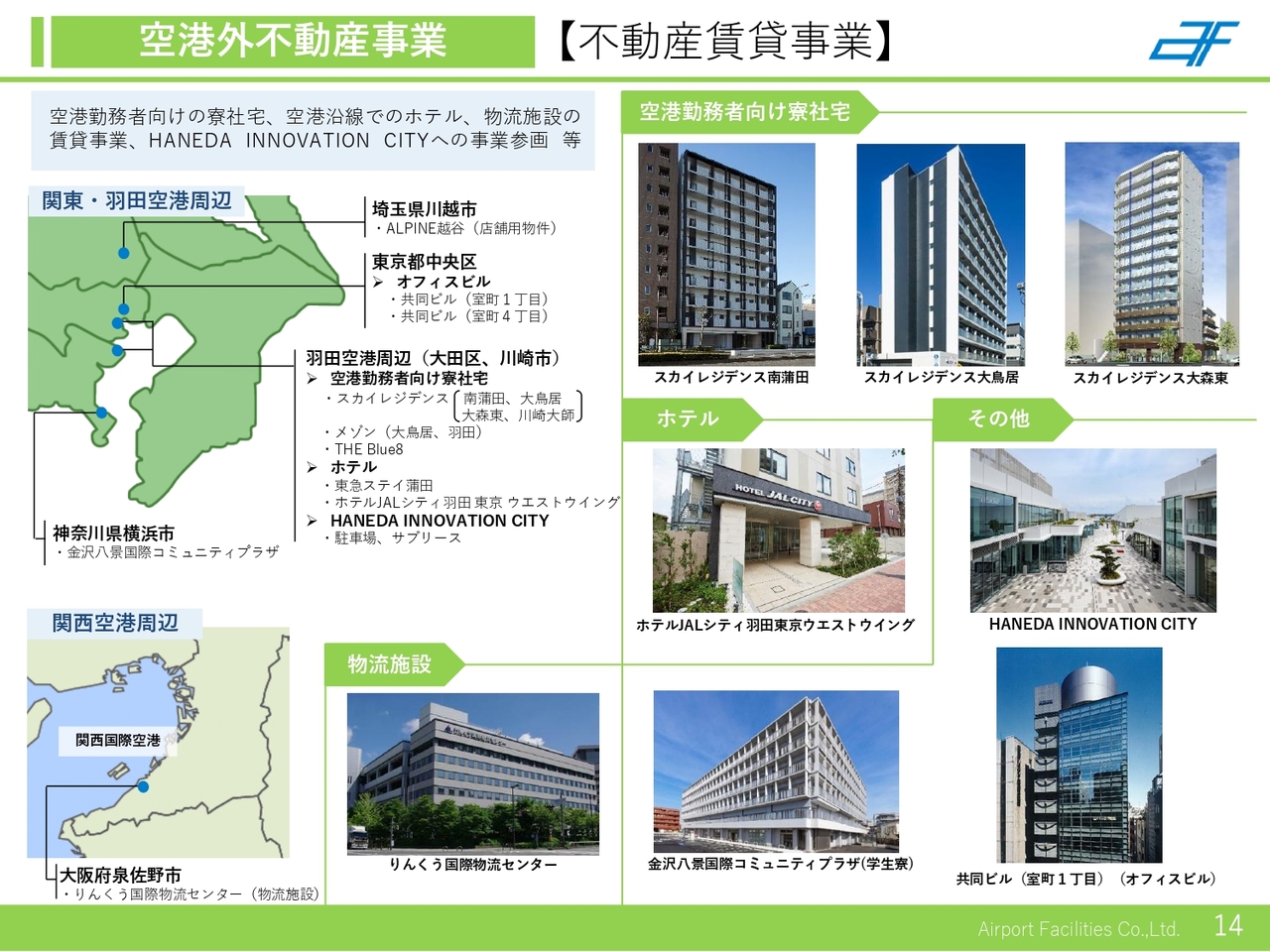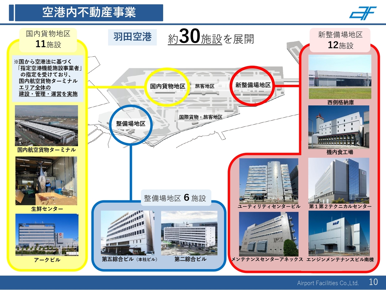 また、貨物ターミナルに関しては、羽田空港内の国内貨物ターミナルを運用しているほか、関西国際空港の対岸にあるりんくうタウンなどのエリアで、国際物流を扱う施設を所有し賃貸しています。そのため、物流企業さまとも多くの関係を築いています。