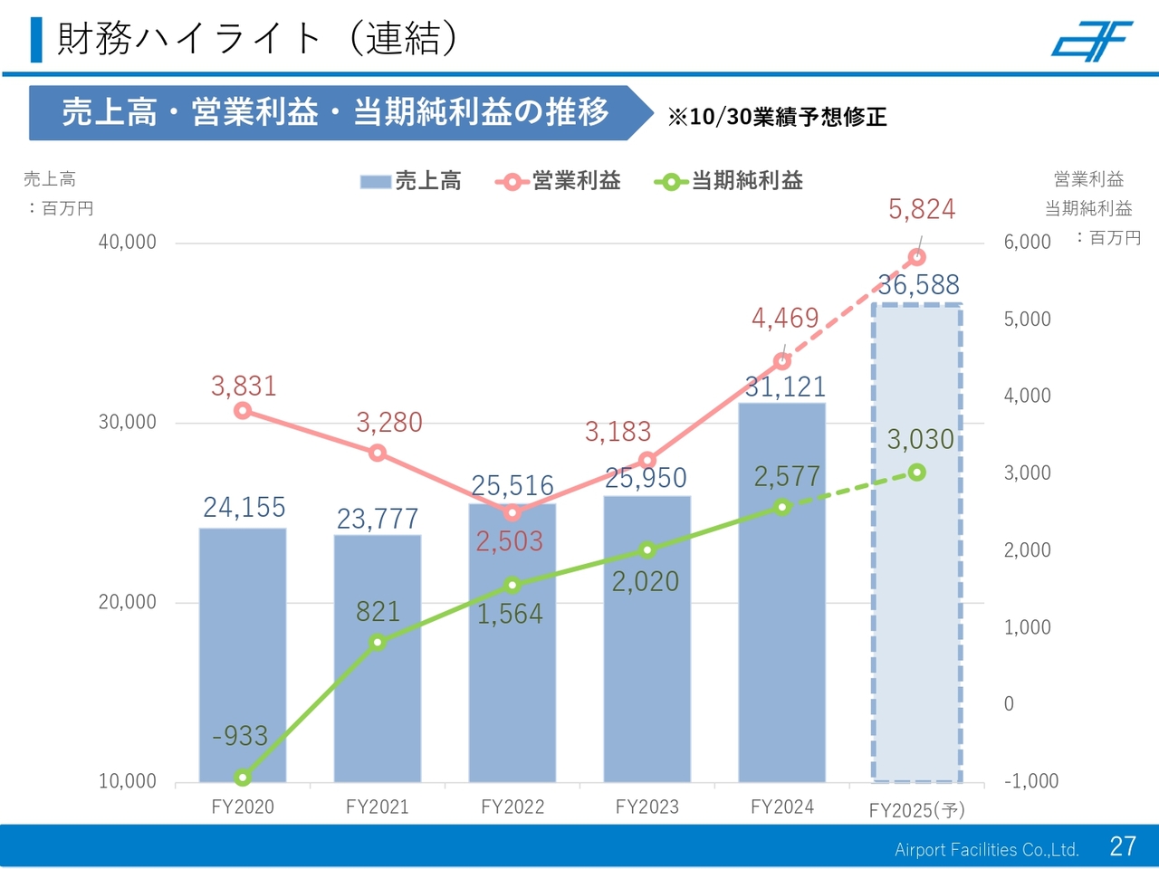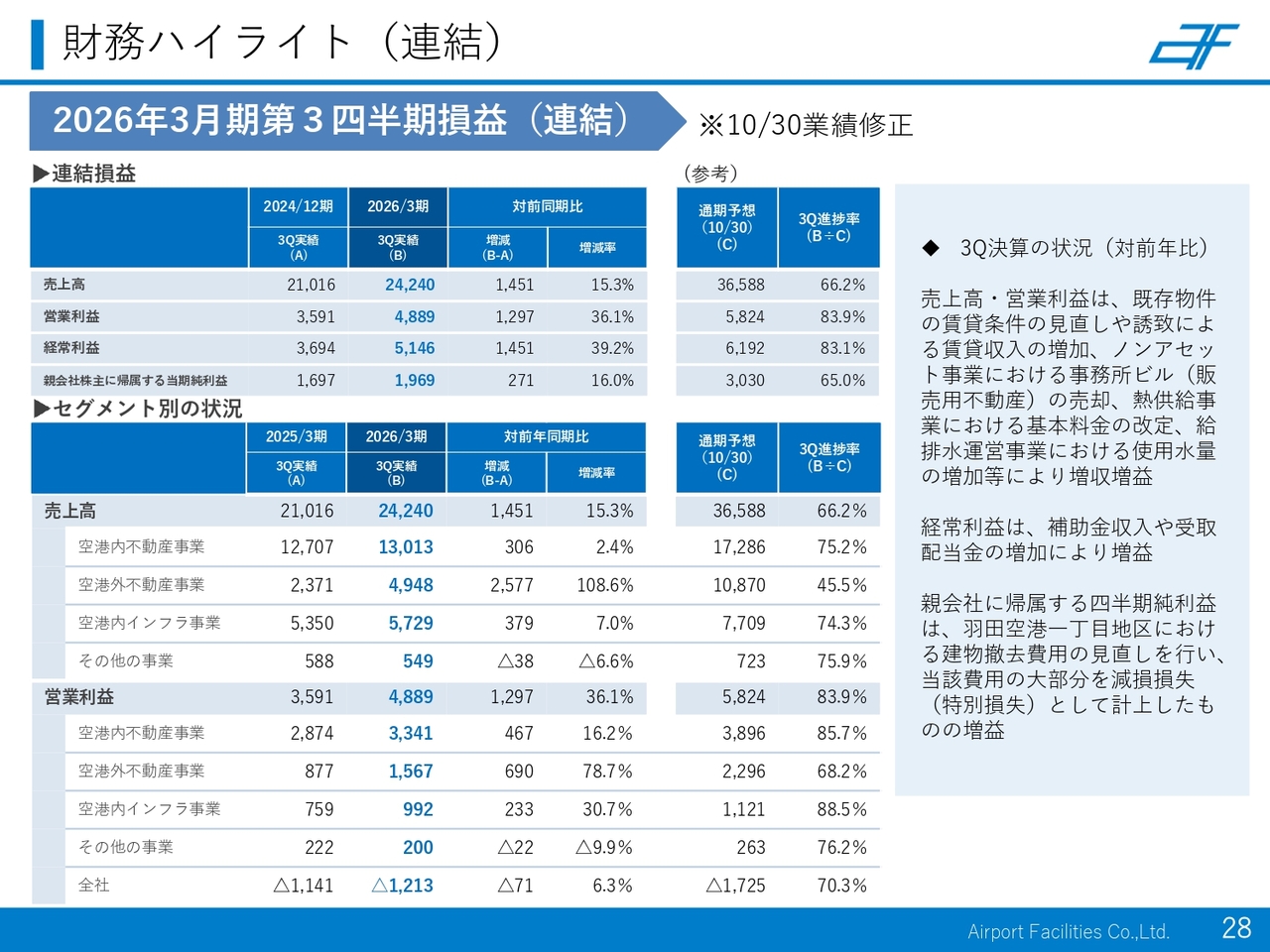親会社株主に帰属する当期純利益については、羽田空港一丁目地区における建物撤去費用の見直しを行ったため、この費用の大部分を減損損失として計上しましたが、売上高や営業利益の増加によりカバーしています。また、スライド中央に示している通期予想に対しても順調に推移しています。