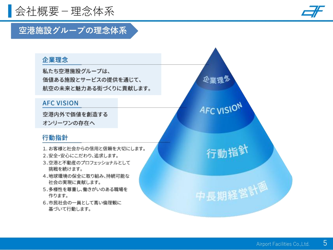 笹岡:当社の理念体系についてご説明します。当社は「空港施設」という会社名が事業内容を端的に表しているとおり、空港における事業を中心に「価値ある施設とサービスの提供を通じて、航空の未来と魅力ある街づくりに貢献する」という企業理念を掲げています。