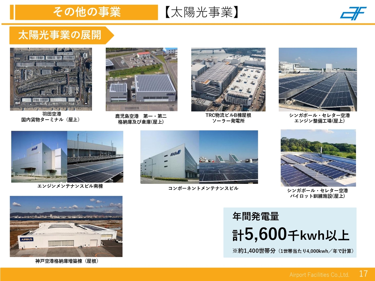 笹岡:太陽光事業についてです。当社が所有する貨物ターミナルや格納庫の屋根を活用して太陽光パネルを設置し、発電した電力を使用することで、CO2削減に向けた取り組みを推進しています。