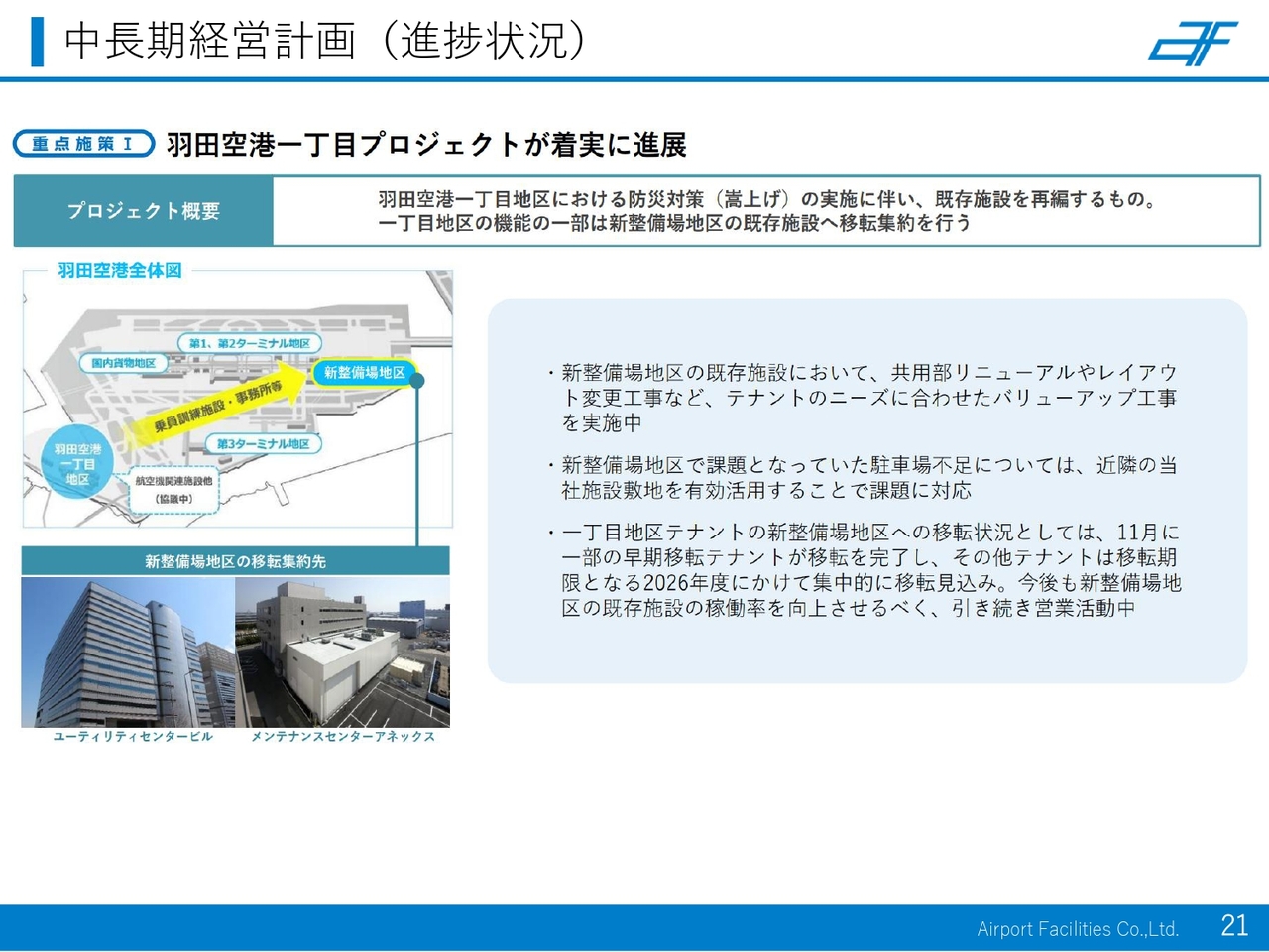 回答:当社事業への収益貢献という面では、中長期経営計画の重点施策Ⅰで「羽田空港内事業の更なる強化」を掲げているとおり、羽田空港における事業は当社の収益の多くを占める主力事業であり重要視しています。具体的な取り組み案件として、羽田空港一丁目地区の再編や機能移転に伴い、既存施設を有効活用することで、顧客ニーズへの対応力向上や利便性の向上が期待され、これにより、収益の最大化や資本効率の改善にも寄与するものと考えています。羽田空港内では、他にも国内貨物地区における機能強化などの取り組みも進めています。