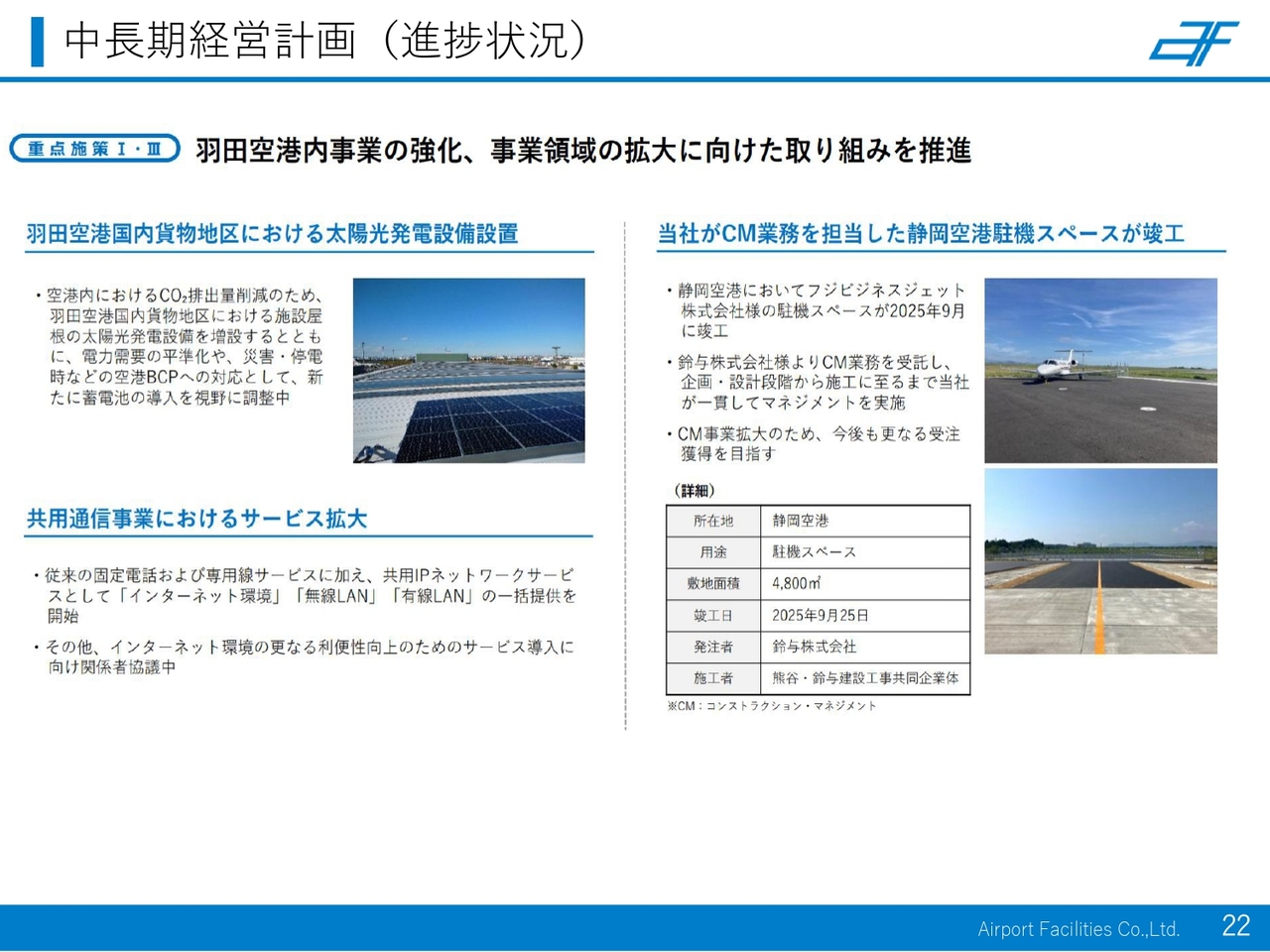 また、重点施策Ⅲにおいては、地方空港においても、格納庫の増築提案等を積極的に進めており、羽田ほど規模は大きくないものの、整備需要の増加に伴う施設の狭隘化や、施設老朽化に伴う建替え需要もあります。あわせて、「省エネ」「再エネ」の推進に向け、太陽光発電、蓄電池、水素などの環境関連事業にも取り組み、事業領域の拡大にも取り組んでいるところです。