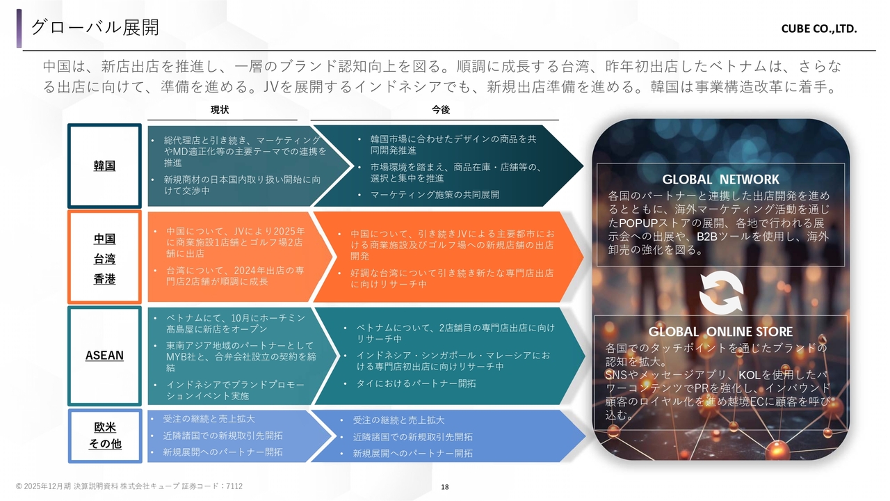 ECでは、2025年12月期にプラットフォームのリニューアルを実施し、UI/UXの改善を行いました。2026年12月期は、アプリと連動したマーケティングをさらに強化していきます。併せて、生成AIを活用した動画制作や、アンバサダーによるパワーコンテンツの強化を通じたグローバルでのSNS配信を進めるなど、引き続きオペレーションの高度化に注力します。