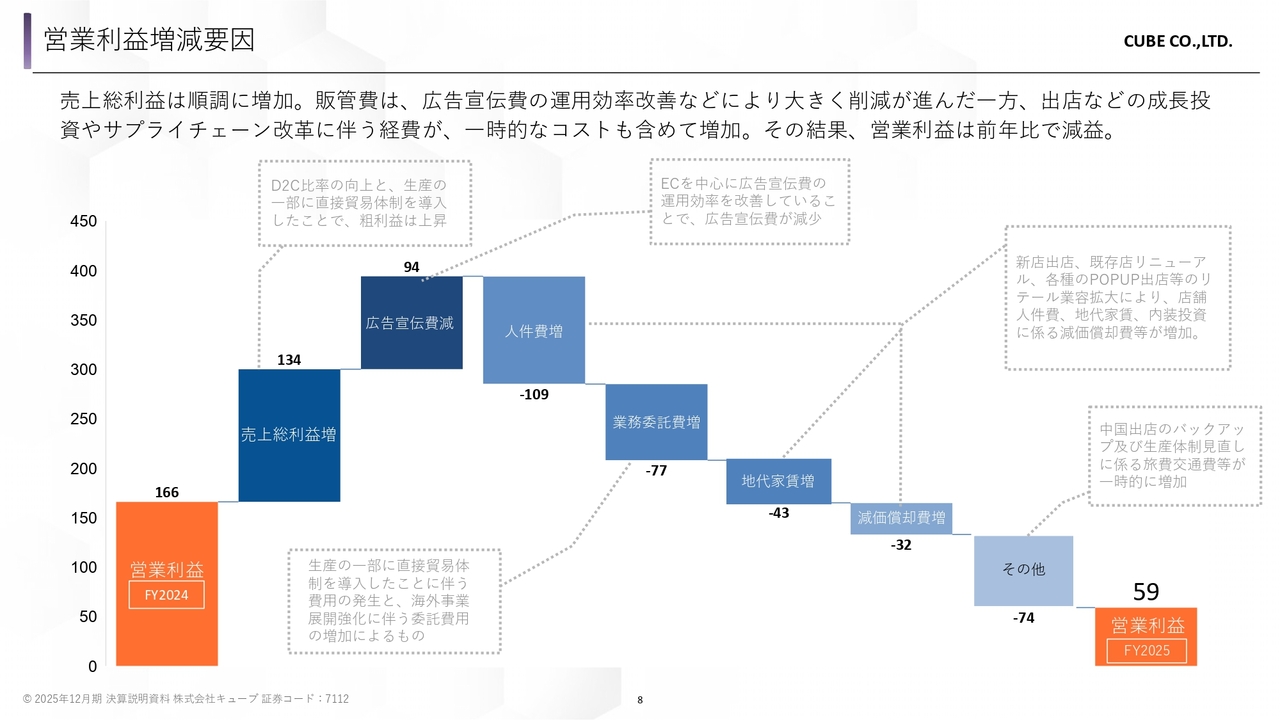 販売管理費のうち広告宣伝費については、ECを中心に広告運用効率の改善を進めたことで減少しています。一方で、出店などの成長投資やサプライチェーン改革に伴う経費が一時的なコストを含めて増加したことから、営業利益は前期比で減益となっています。