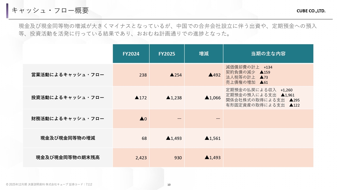 キャッシュ・フローの概要です。現金および現金同等物が大きくマイナスとなっています。これは、中国で合弁会社を設立したことに伴い約3億円を支出したこと、また手元資金の運用見直しに伴い普通預金から定期預金への振り替えを実行したことによるものです。これらは計画どおりの進捗であり、引き続き手元資金の戦略的活用に努めます。