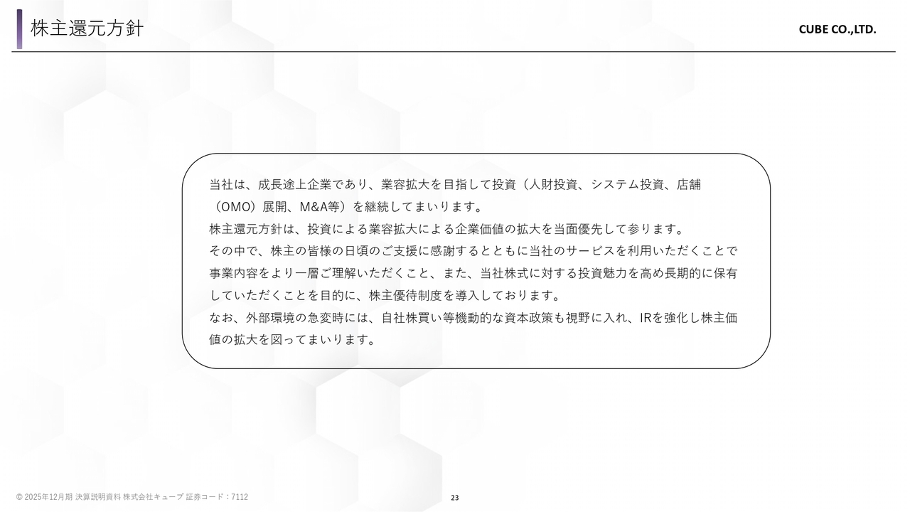 株主還元方針についてご説明します。当社は成長途上企業であり、業容拡大を目標に投資を継続していきます。株主還元方針としては、投資に基づいた業容拡大による企業価値の拡大を優先しています。その一環として、株主優待制度を2025年より導入しました。