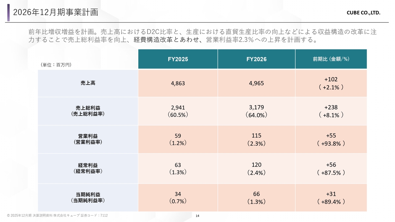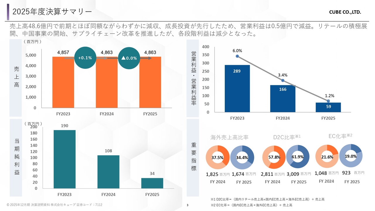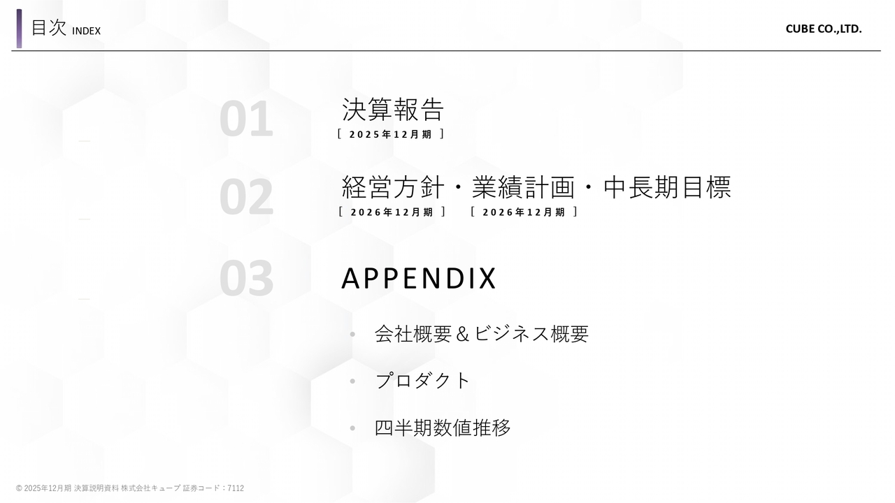 橋本和武氏(以下、橋本):株式会社キューブ代表取締役社長CEOの橋本です。本日はお忙しい中、2025年12月期決算説明会にお集まりいただき、誠にありがとうございます。それでは、本決算についてご説明します。よろしくお願いします。