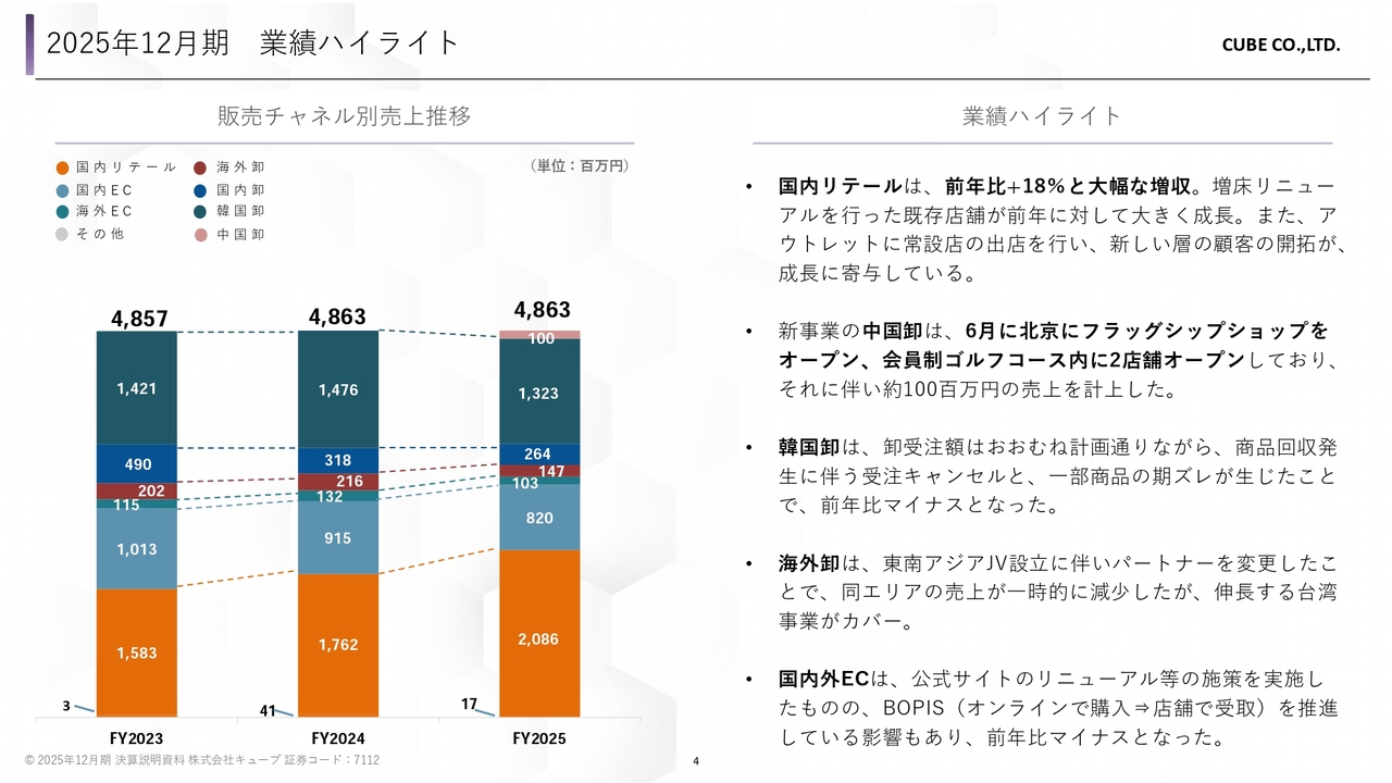 2025年12月期は、国内リテールの成長や、グローバル戦略の柱となる中国での事業開始など、新たなステージへの一歩を踏み出しました。天候不順や商品回収などの不測の事態が重なり、不十分な点もありましたが、成長戦略は着実に推進しています。