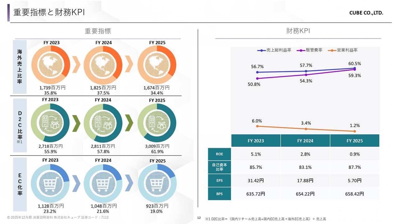 重要指標については、海外売上高比率が34.4パーセントと前期比で3.1ポイント縮小しましたが、D2C比率は61.9パーセントと前期比で4.1ポイント増加しており、直営事業が順調に拡大しています。一方、EC化率は19.0パーセントと前期比で2.6ポイント減少しています。