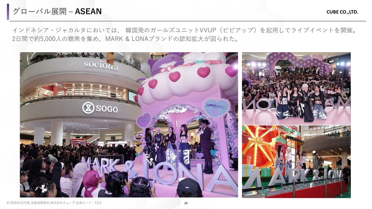 ASEAN地域での展開についてご説明します。インドネシア・ジャカルタのSOGO百貨店において、韓国発のガールズユニット「VVUP(ビビアップ)」を起用したコラボレーションイベントを12月に開催しました。「VVUP」はメンバー4名のうち1名がインドネシア出身ということもあり、東南アジア、特にタイやインドネシアで高い人気を誇っています。