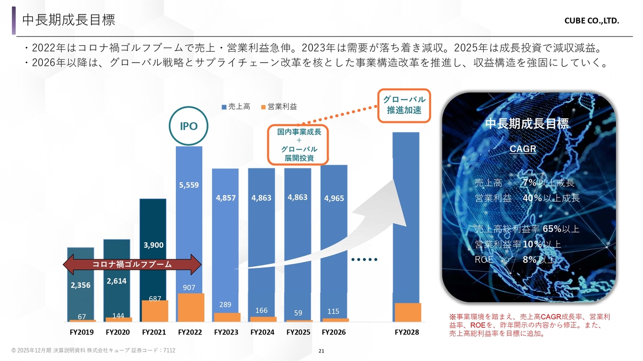 中長期成長目標についてご説明します。2022年12月期は、コロナ禍におけるゴルフブームを背景に、売上高・営業利益ともに大きく伸長しました。アフターコロナとなる2023年12月期は需要が落ち着き減収となりましたが、2024年12月期および2025年12月期はほぼ横ばいで売上高が推移しています。