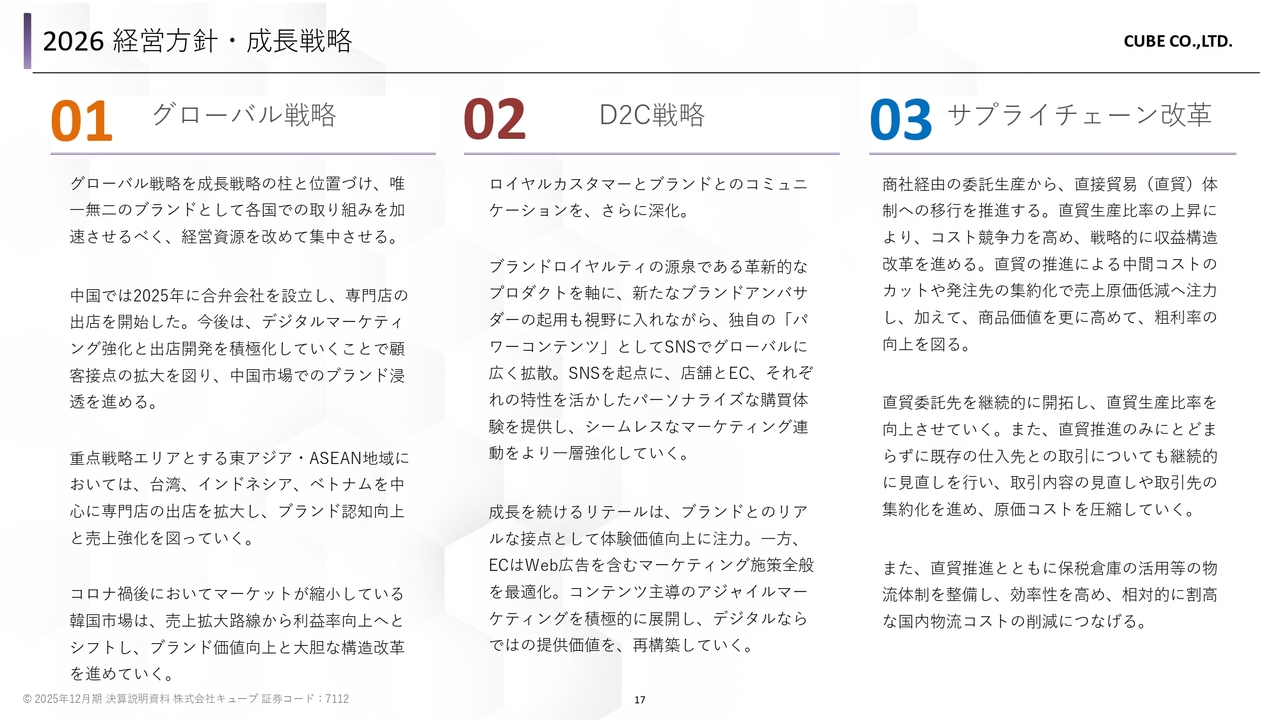 経営方針および成長戦略です。2026年12月期は「グローバル戦略」「D2C戦略」「サプライチェーン改革」に注力します。