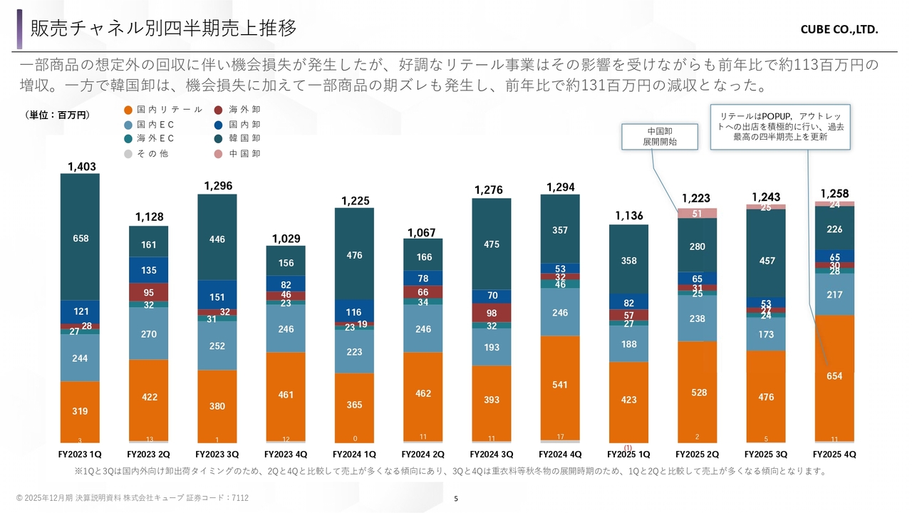 販売チャネル別の売上推移です。2025年12月期第4四半期は、チャネル合計で12億5,800万円の売上となりました。想定外の商品回収の影響があったものの、国内リテールは6億5,400万円となり、前年同四半期比で約1億1,300万円の増収となりました。引き続き成長を維持しています。