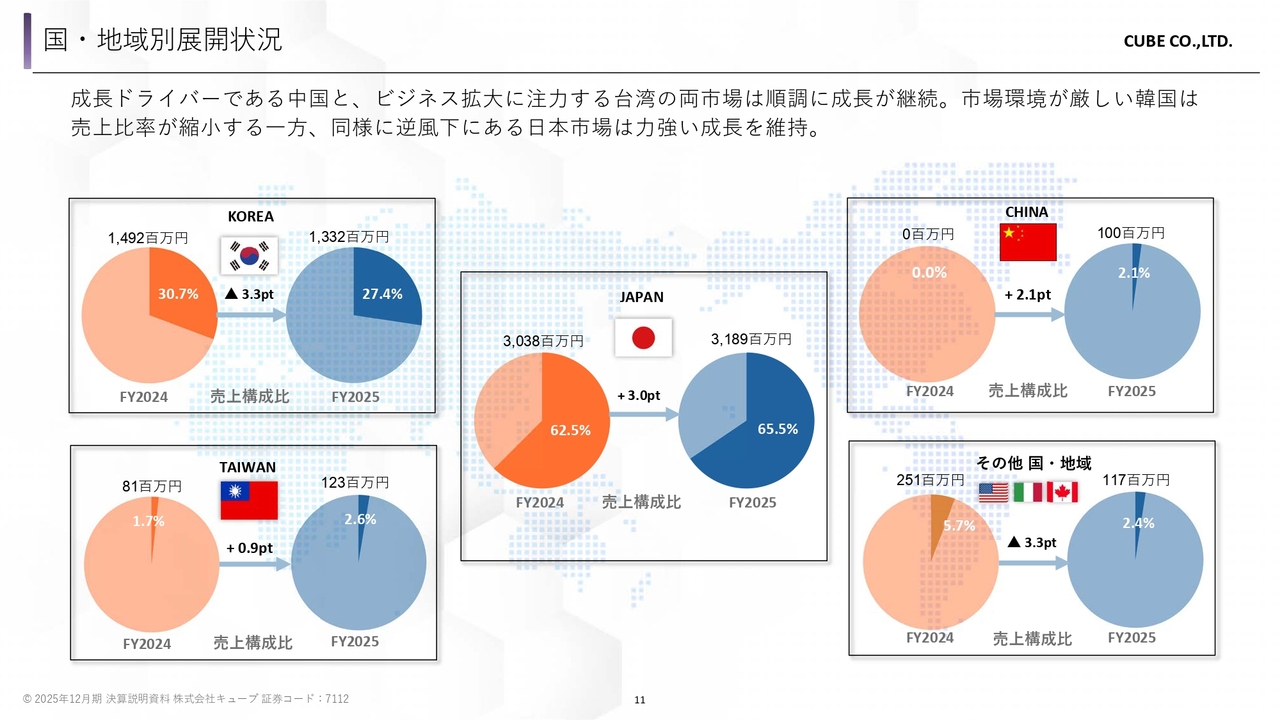 国別および地域別の展開状況についてご説明します。成長ドライバーである中国と、ビジネス拡大に注力している台湾の両市場では、順調な成長が続いています。一方、市場環境が厳しい韓国では、売上構成比が前期比3.3ポイント減少しました。