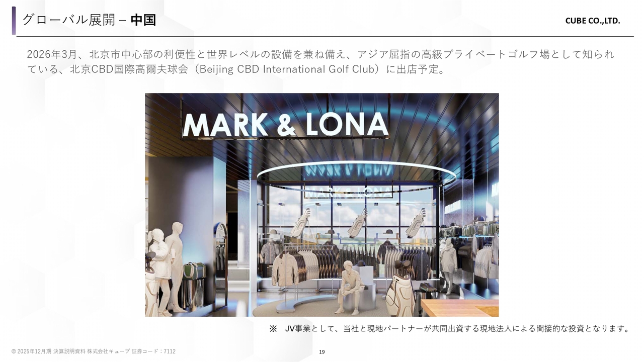 中国市場では、2025年12月期に現地パートナーと合弁会社を設立し、旗艦店を含む3店舗を出店しました。2026年12月期についても、主要都市の商業施設やゴルフ場での出店開発を積極的に進めていきます。