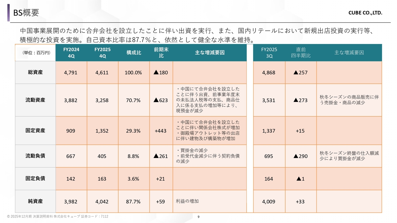 BSの概要についてご説明します。中国事業向けの合弁会社設立に伴い出資を実行したことで、流動資産が減少しました。一方、出資に伴う関係会社株式の増加に加え、新店オープンによる建物および構築物の増加により、固定資産は増加しています。
