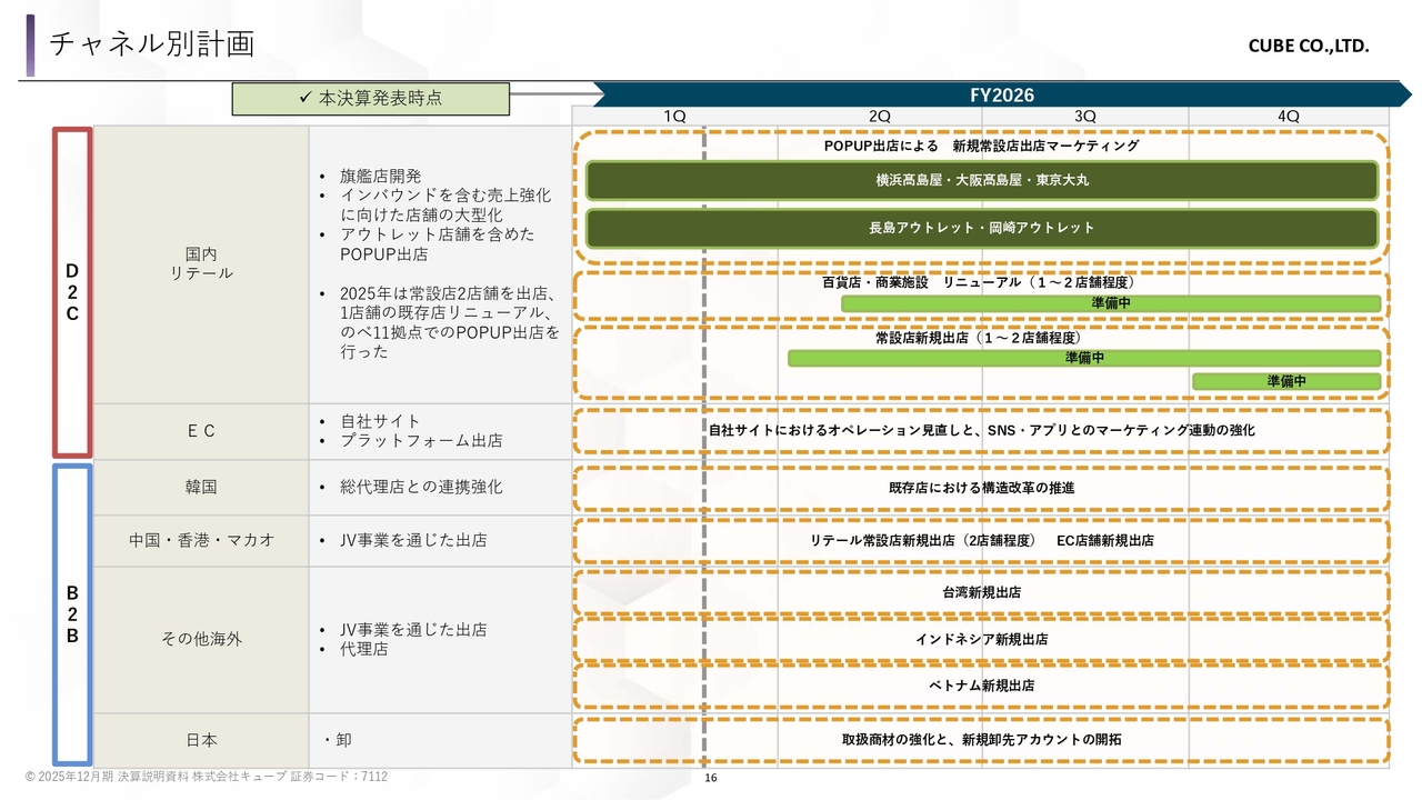 チャネル別の計画についてご説明します。D2Cのうち、国内リテールについては、2025年12月期に延べ11拠点でポップアップストアを出店し、新規顧客の獲得と認知度の向上を図りました。また、新たに2店舗の常設店を出店しました。