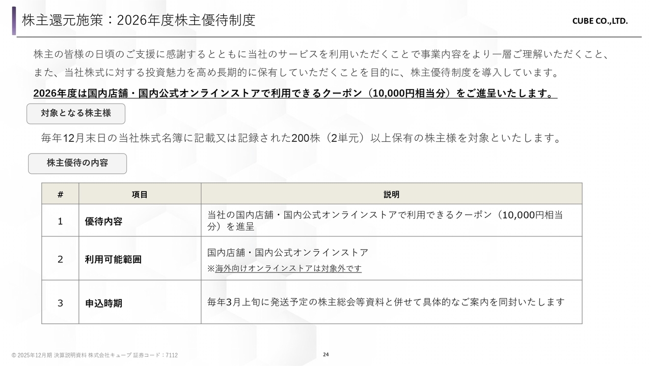 最後に、株主還元施策として、株主優待制度についてご説明します。毎年12月末日の当社株式名簿に記載または記録された200株以上を保有する株主さまが対象です。内容としては、当社ブランドの国内店舗および公式オンラインストアで利用できる1万円相当のクーポンを進呈します。