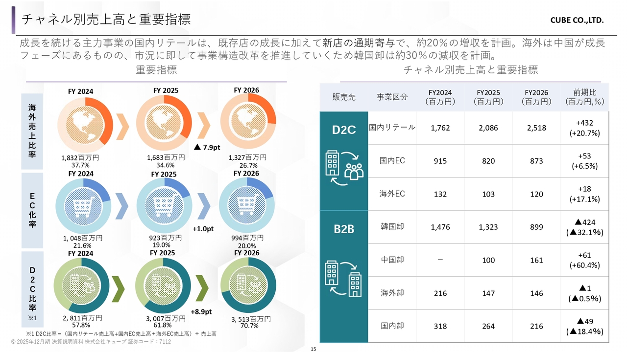 重要指標については、D2C比率が前期の61.8パーセントから8.9ポイント増加し、70.7パーセントとなる見込みです。D2C比率については、ロイヤルカスタマーとの接点拡大につながり、持続的な成長を示す重要な指標として、引き続き強化していきます。
