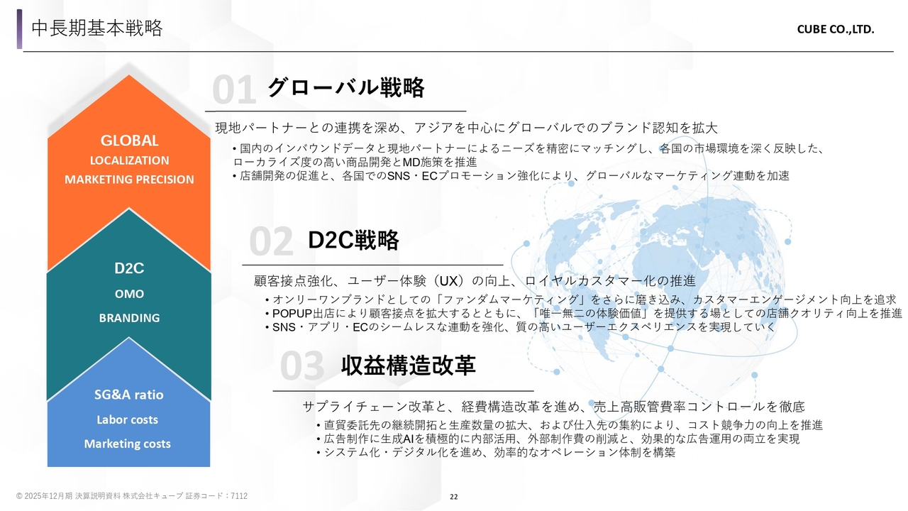 中長期戦略についてご説明します。成長ドライバーとして、「グローバル戦略」に注力し、事業の基盤となる「D2C戦略」をさらに強化するとともに、経費構造改革を進めることで「収益構造改革」を図ります。