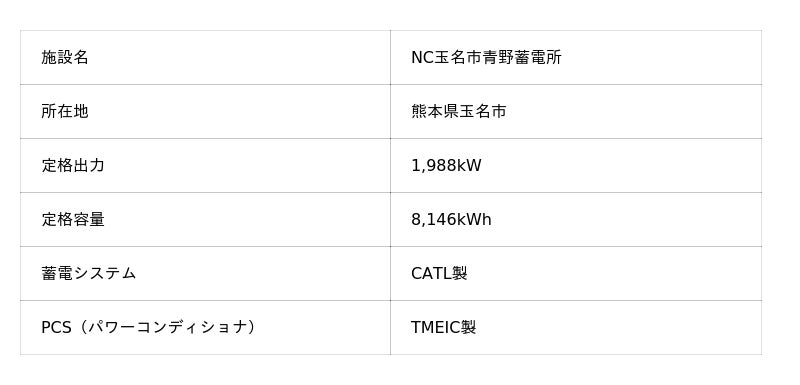 このたび、その第1号案件として熊本県玉名市の系統用蓄電所「NC玉名市青野蓄電所」(定格出力約2MW、定格容量約8MWh)が、2026年3月5日に受電を開始しました。本蓄電所は2026年6月頃に需給調整市場への参入を予定しており、地域分散型エネルギー拠点として電力系統に調整力を提供し、電力の安定供給に貢献します。