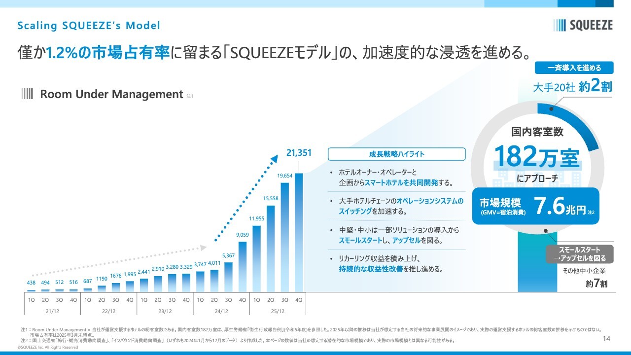 ホテル業界全体の市場規模は180万室以上と非常に大きく、莫大なTAMを有しています。その中で当社の市場シェアは約1.2パーセントです。したがって、依然として約99パーセントの市場を狙える状況にあり、ホテル産業は非常に大きなマーケットだと捉えています。