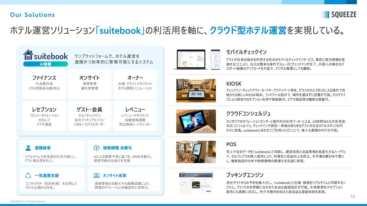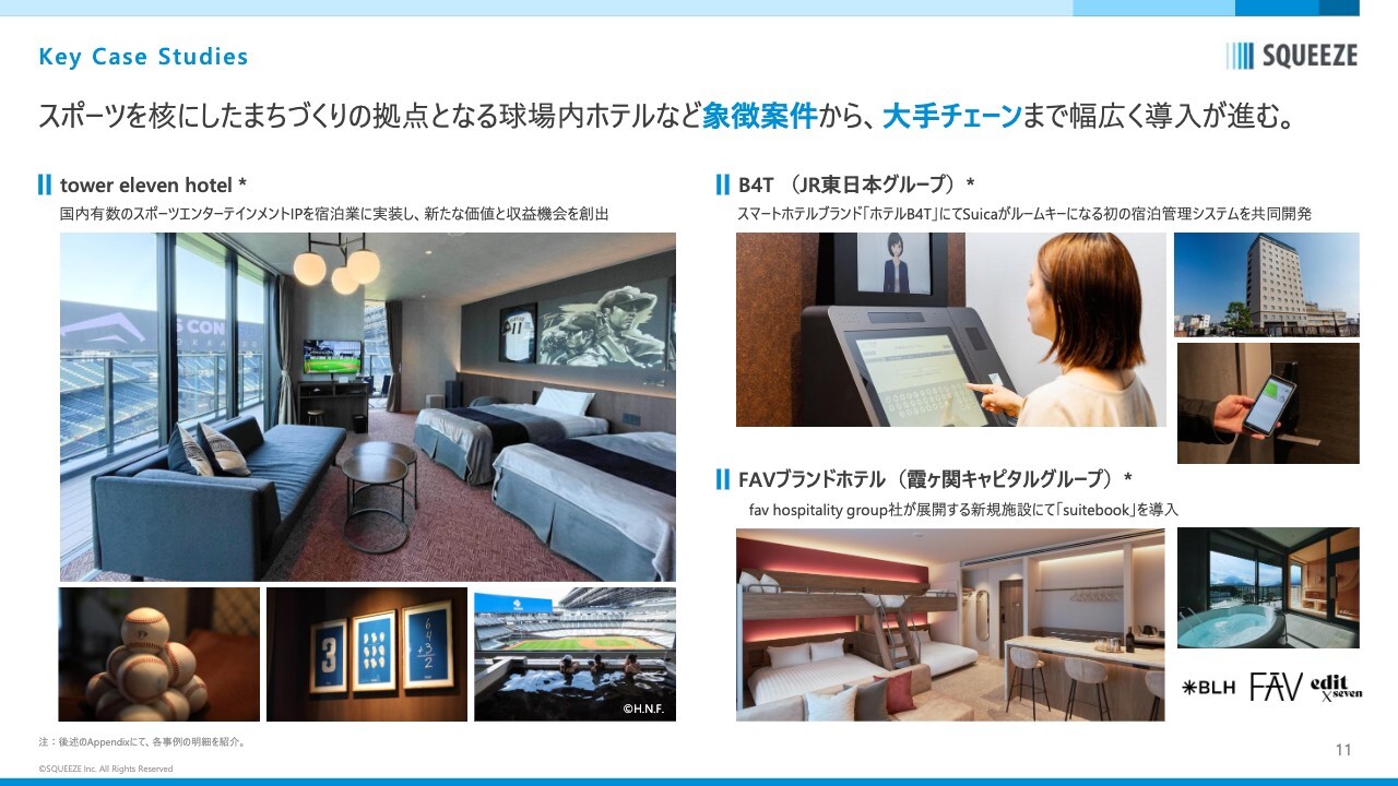 スライド右側下段は「FAVブランドホテル」です。霞ヶ関キャピタルグループは複数ブランドのホテルを運営しており、最近もプレスリリースを出しましたが、現在開業している物件には、当社の「suitebook」運営プラットフォームが全店で導入されています。