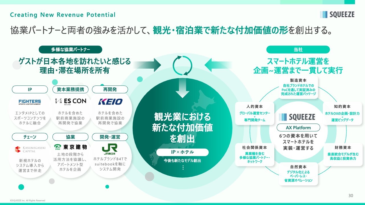 ファイターズ社との提携事例では、同社のIPコンテンツを活用してホテルを運営することで、付加価値を創出しています。このような取り組みを、ホテル業界における新たな挑戦として展開できるのではないかと考えています。