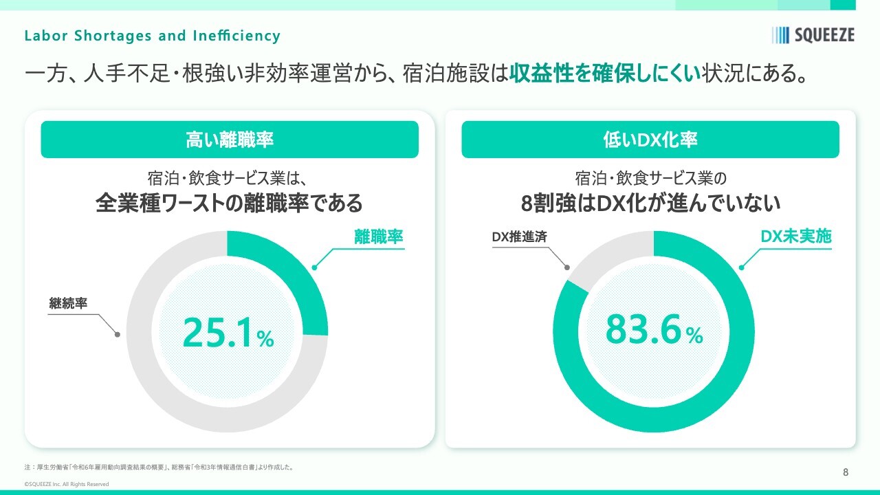 ホテル運営は非常に煩雑で、人手のかかる大変な業務です。例えば、多言語での受付業務や電話対応、客室清掃、管理、会計、レベニューマネジメント(価格調整)など、多岐にわたる業務を担う必要があり、運営の複雑さが課題となっていました。