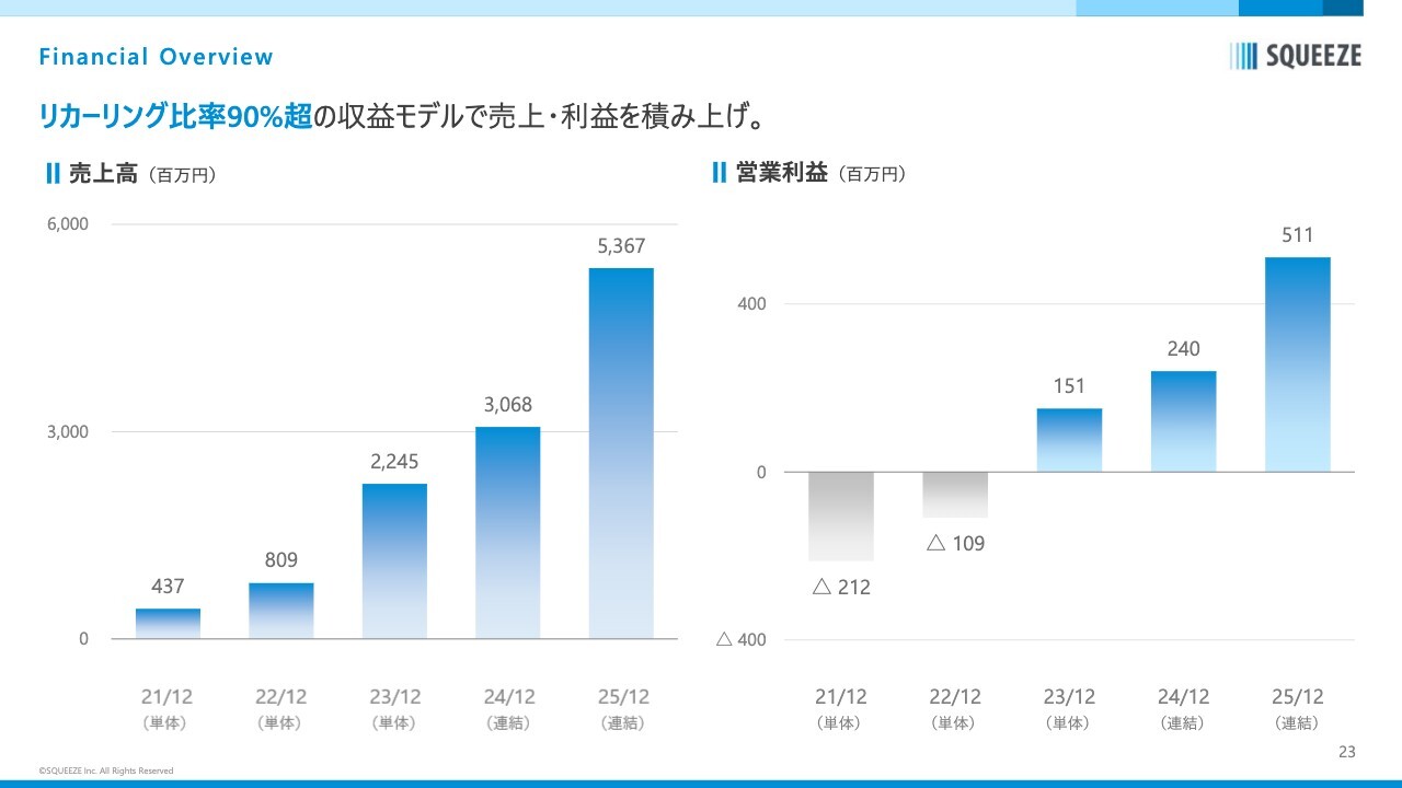 Financial Overviewです。特に営業利益が大きく成長しています。また、コロナ禍にあたる2021年12月期の売上高は4億円でしたが、2025年12月期には53億円を突破し、4年間で12倍の成長を遂げました。