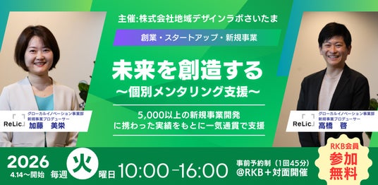 スタートアップ・新規事業開発支援で国内有数の実績を持つ株式会社Relicと連携し、創業・起業、新規事業開発に取り組む事業者を対象とした伴走型メンタリング支援を2026年4月14日(火)より毎週火曜日に開始しました。