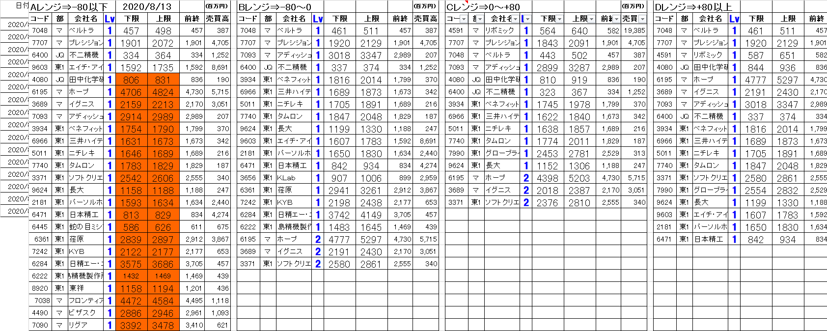 2020/8/13(木曜日) 今日のシステムトレードの仕掛候補一覧です。今日の日経の寄り付きはいくらでしたでしょうか?仕掛表の各レンジは日経平均の前日終値比... ...続きを読む
