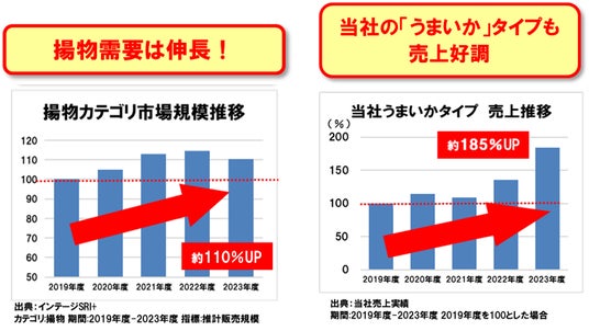 近年、珍味カテゴリの中で揚物商品の市場が伸長しています。ボリューム感があることや、かみ応えの良さ、しっかりとした食べ応えがあり満足度が高いことが理由として考えられ、当社の「うまいか」シリーズも好調です。