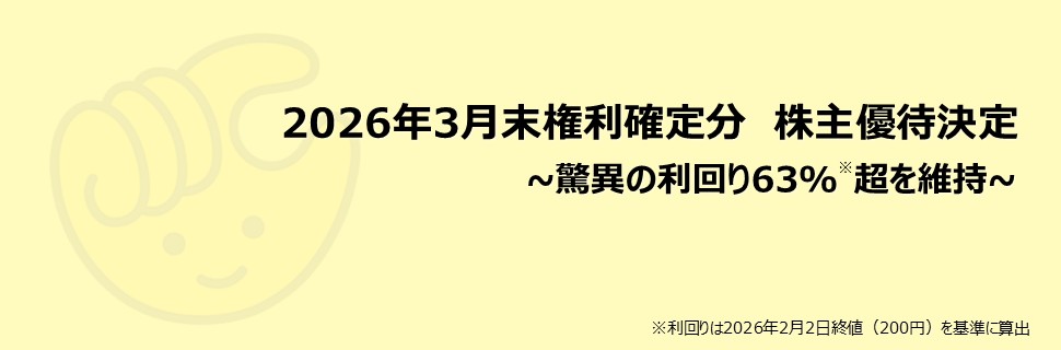 グループ全体で収益基盤の確立を完遂。chocoZAPの爆発的利益成長を原動力に、 営業利益110億円を達成、そしてその先の再成長フェーズへと突入 ハイライト ①異次元の利益成長 連結営業利益は前年同期比15倍の77億円 収益重視への転換とchocoZAPの黒字化定着により、強固な収益基盤を確立。 Q1の一過性特殊要因を補正した最終利益は40億円超。筋肉質な経営基盤へ移行完了。 ②chocoZAP新成長曲線 収益基盤の確立と「直営×FC」の二刀流 会員数減少も底打ちし増加へ。 直営で培った筋肉質な従来モデルに人口密度50人の過疎地でも採算の取れるFCモデルが追加。 相乗効果で投資効率を高め、利益率を維持した出店を加速。 ③株主還元の最大化 復配予定※と優待維持で、総還元利回りを最大化 2026年3月末権利確定の株主優待内容決定。 驚異の優待利回りを維持し、ポイント優待およびデジタルギフト券取扱いブランドも拡充。 株主様の「資産と健康」を強力に支援。 ※復配は現時点における通期業績予想の見通しを前提としたものであり、今後の業績動向等により変更となる場合があります。
