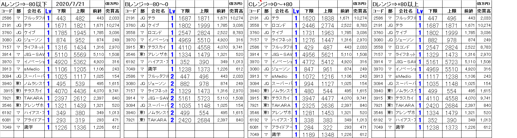 2020/7/21(火曜日) 今日のシステムトレードの仕掛候補一覧です。今日の日経の寄り付きはCレンジでした仕掛表の各レンジは日経平均の前日終値比で以下のよ... ...続きを読む