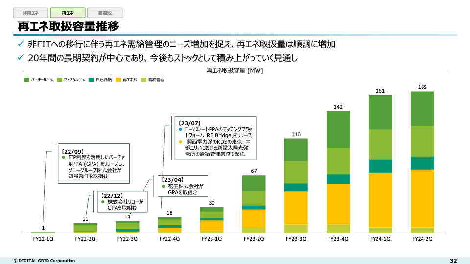 豊田:案件の規模の大きさが主な理由かなと思います。低圧は開発難易度が低く、毎月のように開発できるので毎月のように増えています。比較的連続性がある中で増えていくのに対して、バーチャルPPAやフィジカルPPAは小さいものを束ねるのもけっこう大変です。場合によっては特別高圧になったりして、運転開始までに一気にドーンと積み上がる性質を持っているため、四半期でまったく積み上がらない、ということもあります。