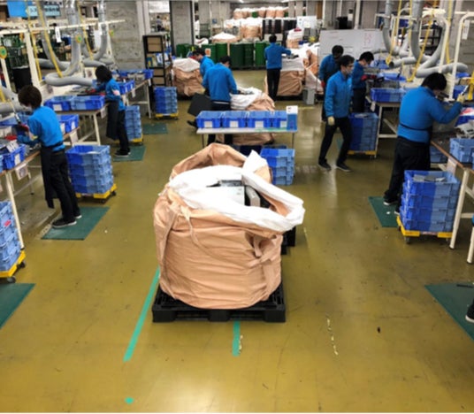 回収したパソコンは、セキュリティが確保された専用施設に運ばれ、1台ずつ手作業で解体し再資源化処理を行います。この手作業の工程で約30人の知的障がいのある方が活躍しています。回収量が増えれば、障がい者の雇用も拡大するモデルを目指しています。